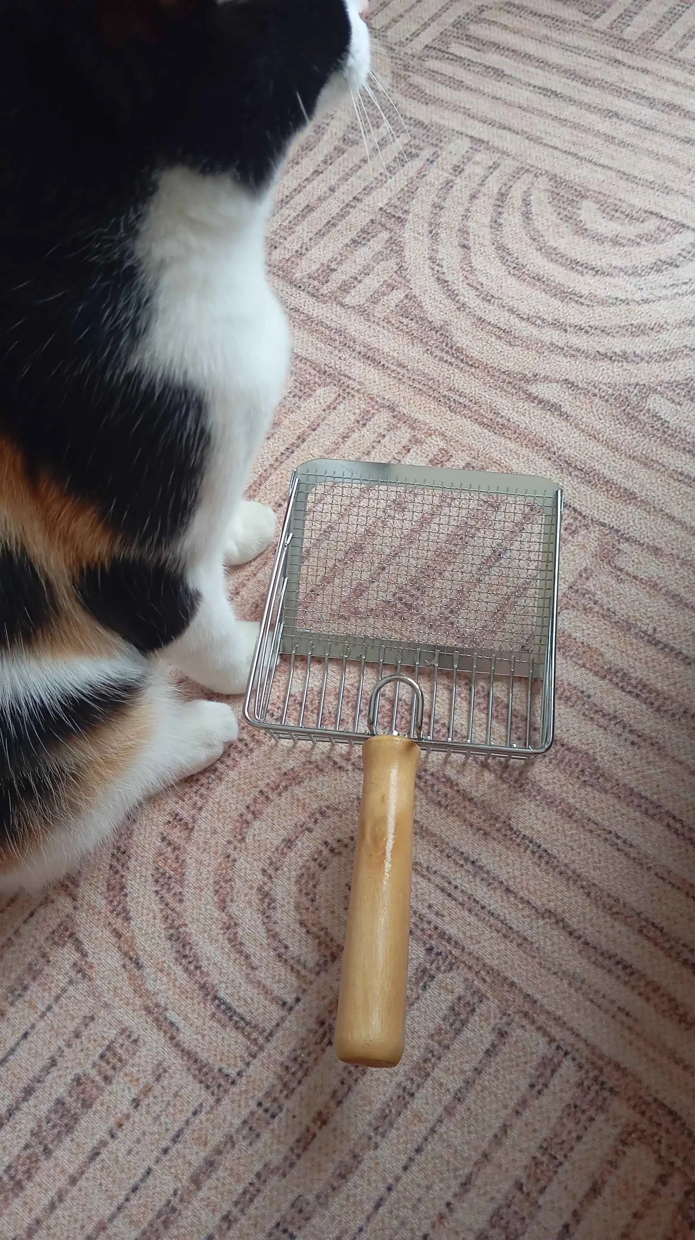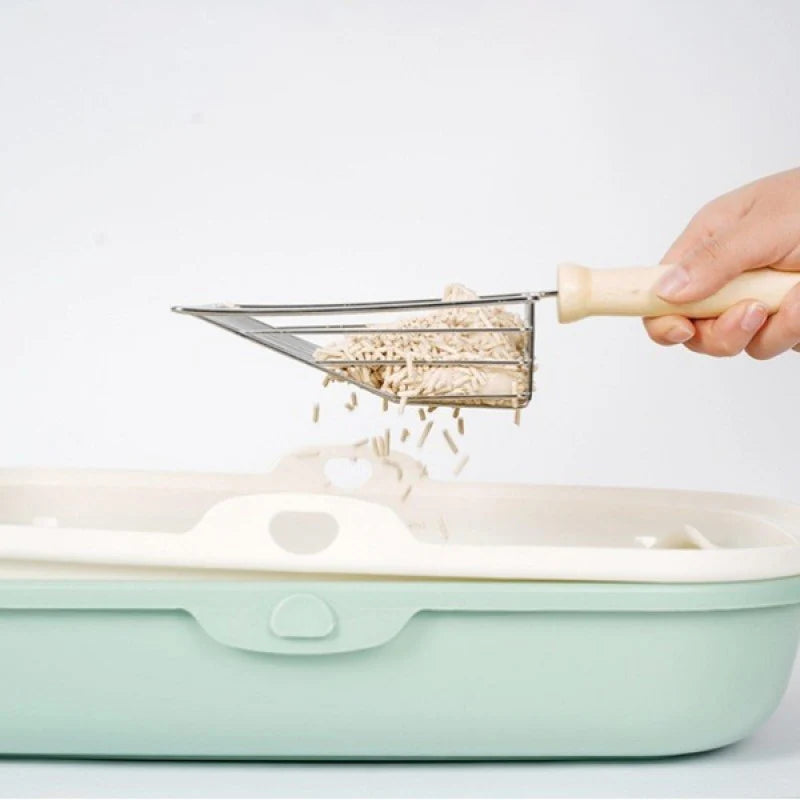 PetPure Ahşap Saplı Metal Kum Küreği, sağlam metal yapısıyla topaklanan kumu hızlıca ayırır.